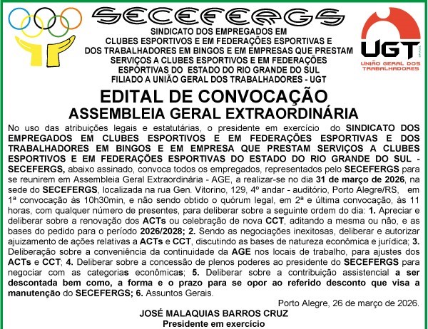 Após Assembleia Geral Extraordinária realizada dia 17 de abril de 2025, na sede do SECEFERGS, quando foi aprovada a pauta de negociação do dissidio para período de 2025/2027 e a realização de Assembleias nos locais de trabalho. Decidiu a diretoria do Sindicato realizar a Assembleia Geral com os trabalhadores do SC INTERNACIONAL, nos dias 08 e 11 de agosto. Após as AGE, as negociações continuaram. A AGE convocada para dias 25/11 e 27/11, será para apreciar e decidir a proposta de Acordo Coletivo de Trabalho - ACT, que foi resultado de r...
